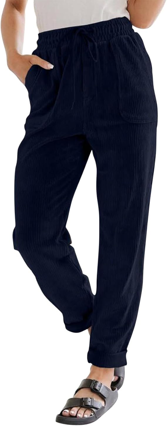 Straight Leg Corduroy Pants for Women Baggy Stretchy Waist Drawstring Pants Business Comfy Work Pants with Pockets